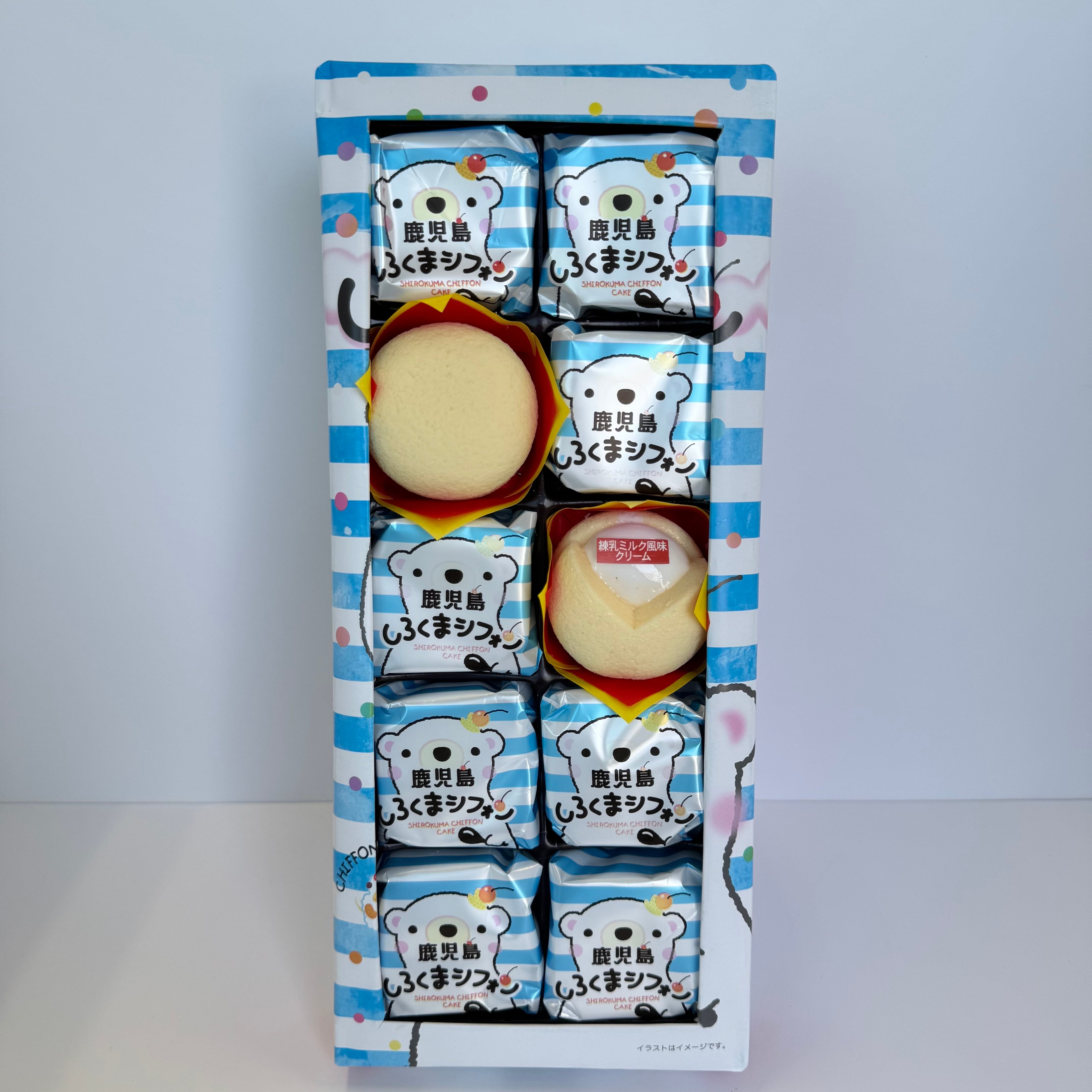 しろくまの可愛いパッケージが特徴的な、練乳味のクリームが入ったシフォンケーキです。 内容量 10個 サイズ(縦×横×高さ) 33×14.5×4
