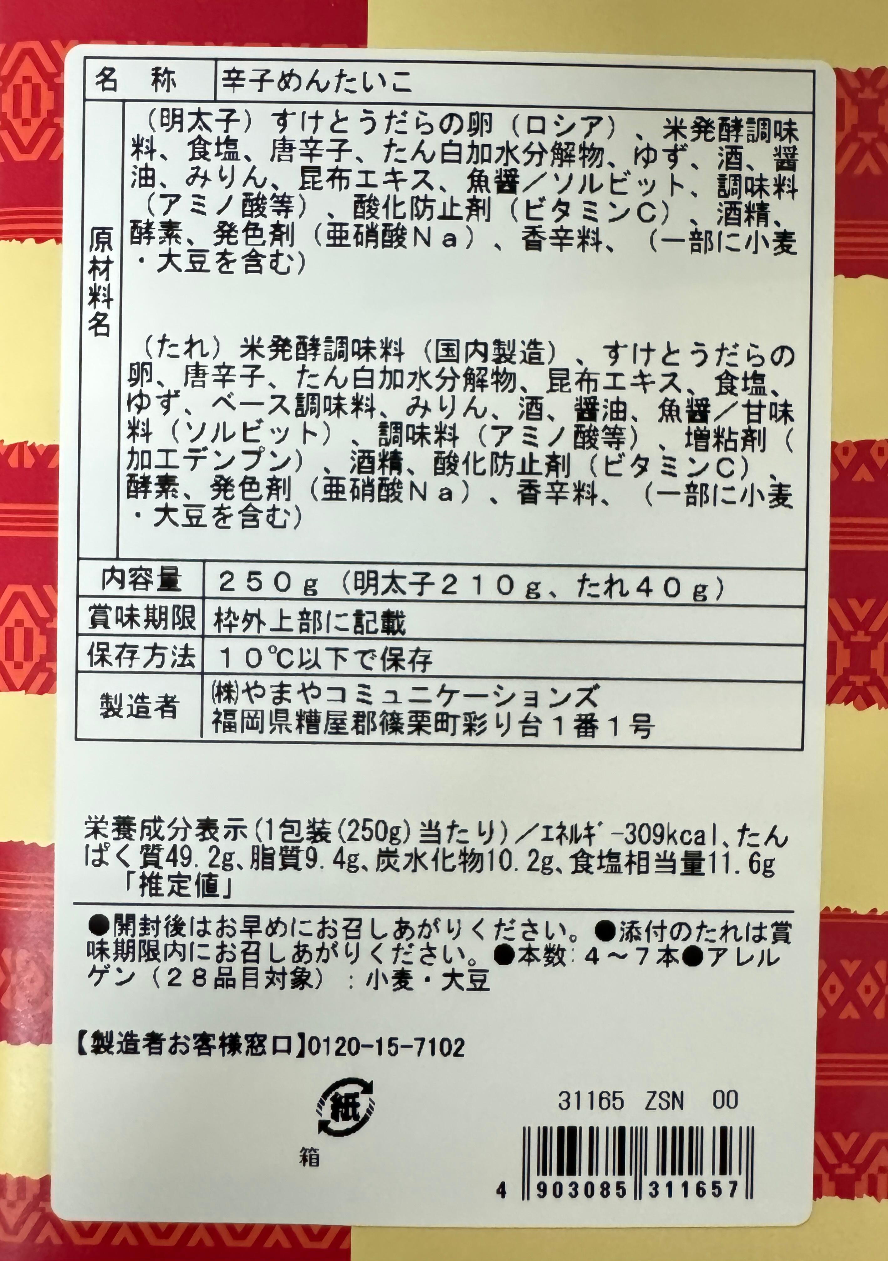 博多の味!やまや特製辛子明太子。(中辛味) 内容量 210g サイズ(縦×横×高さ) 20×13×2.5