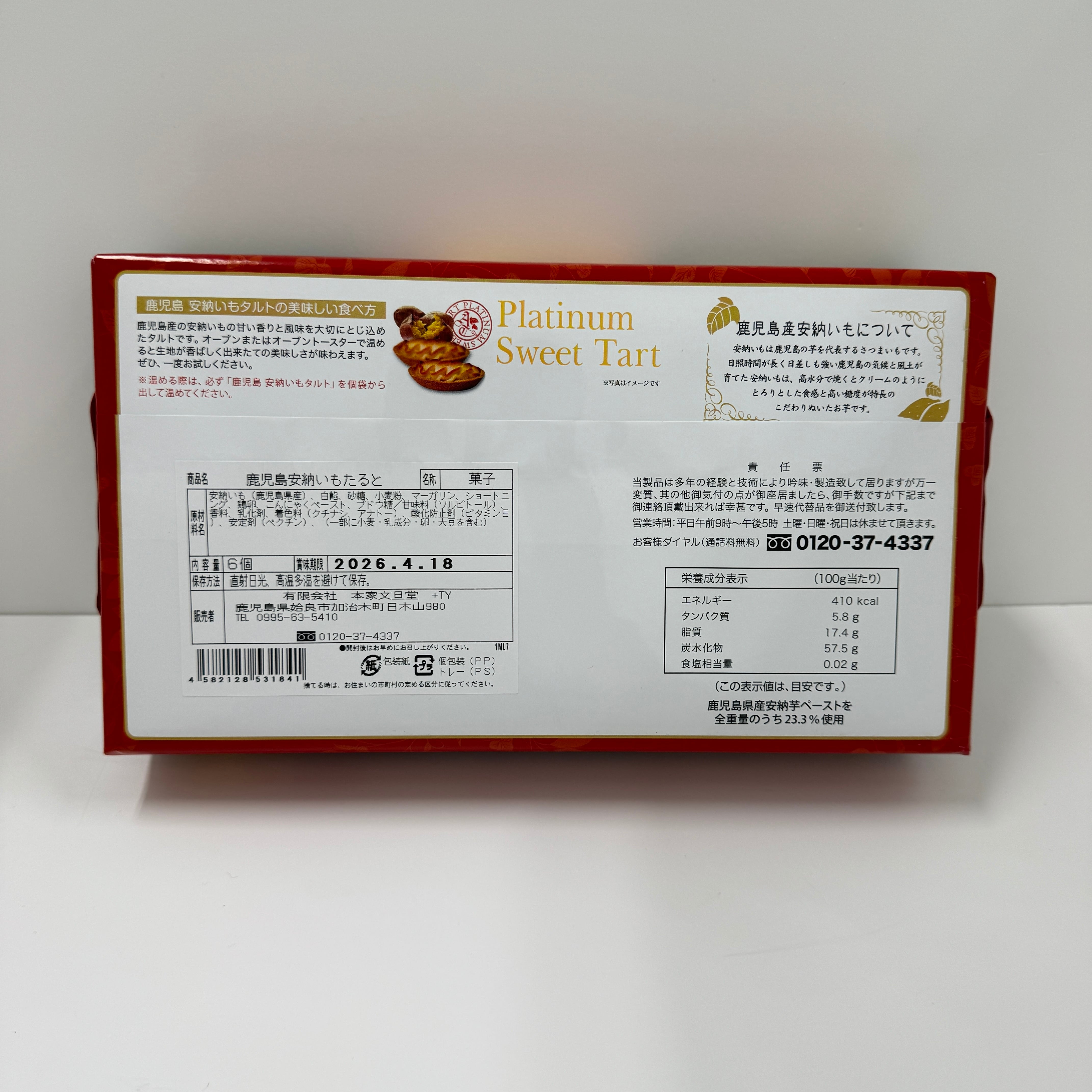 鹿児島県産、安納芋を使用した濃厚タルトです。 こちらは、6個入りになります。 (サイズ 縦15㎝×横27㎝×高さ5.5㎝)