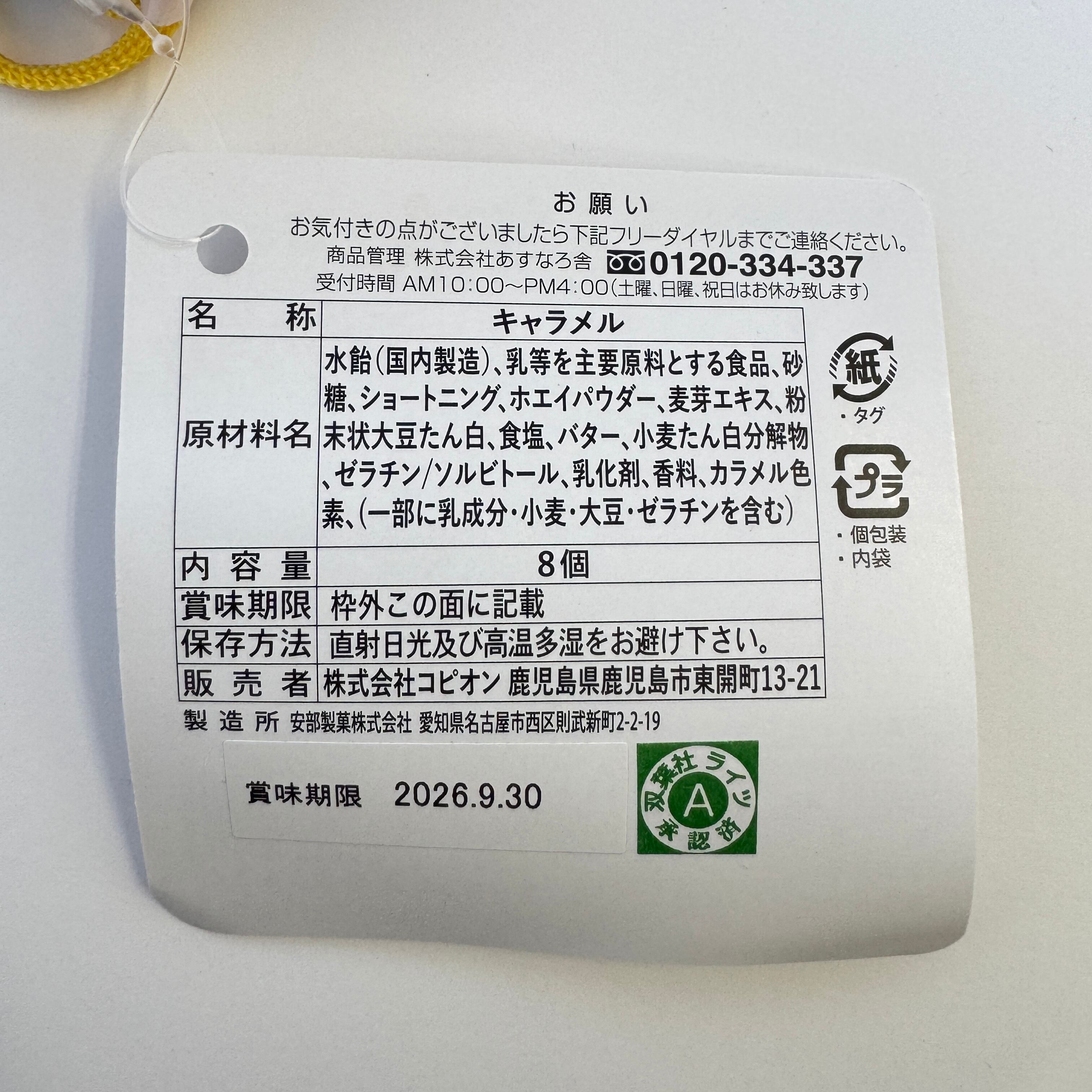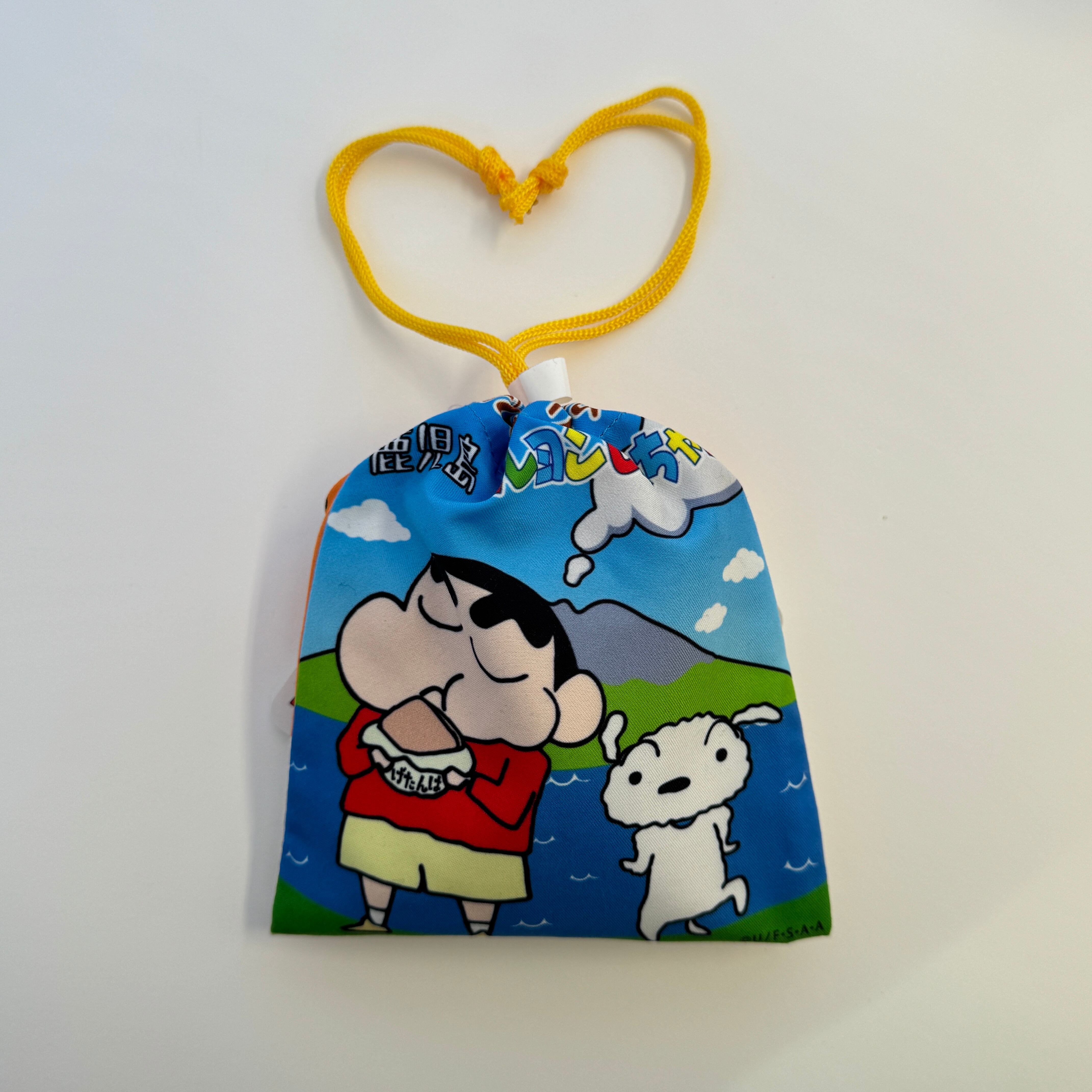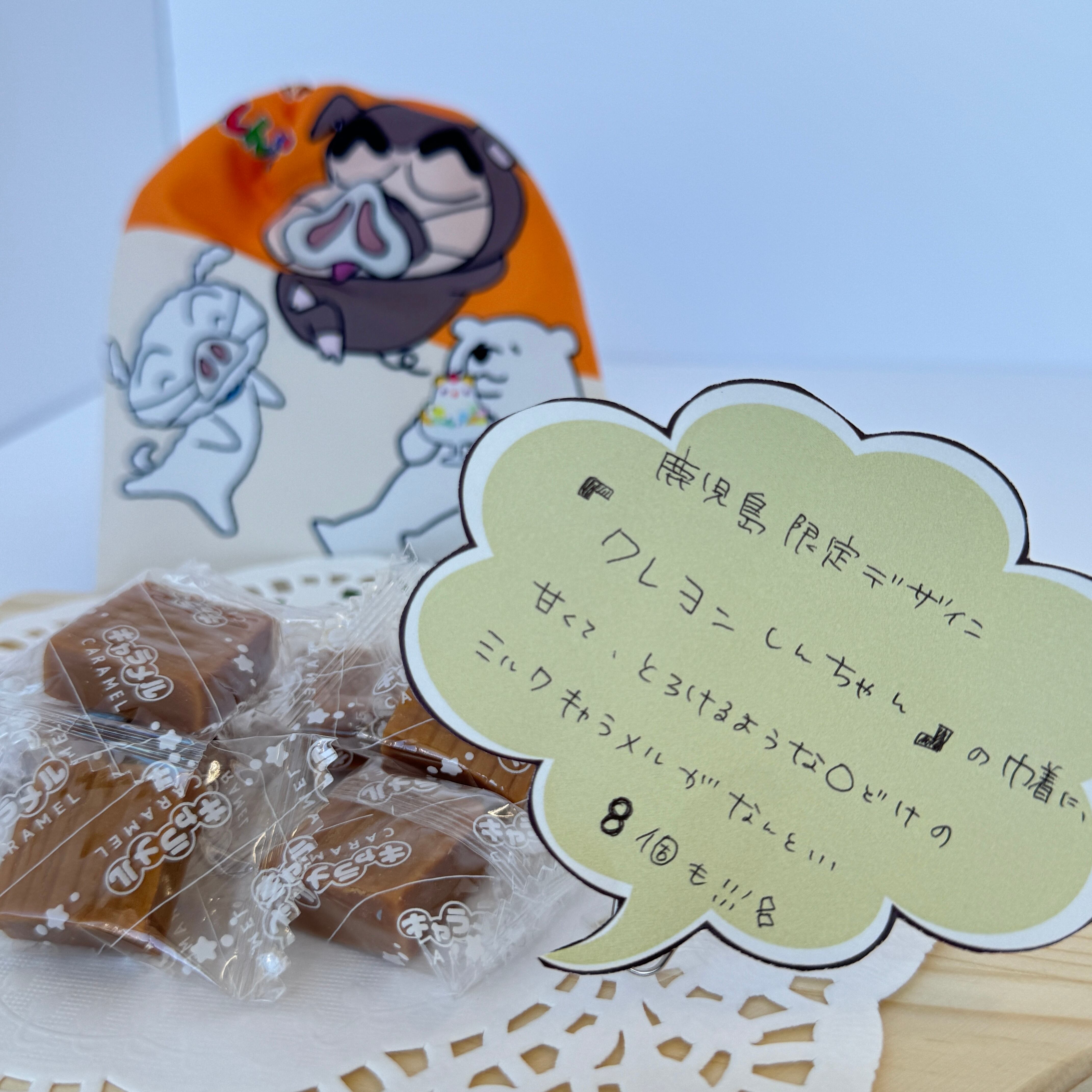 鹿児島限定パッケージのクレヨンしんちゃんキャラメル。中身を食べ終わった後でも、使える巾着がプレゼントにもオススメです。こちらは、8個入りとなります。 (サイズ 縦12㎝×横11㎝×高さ3.5㎝)