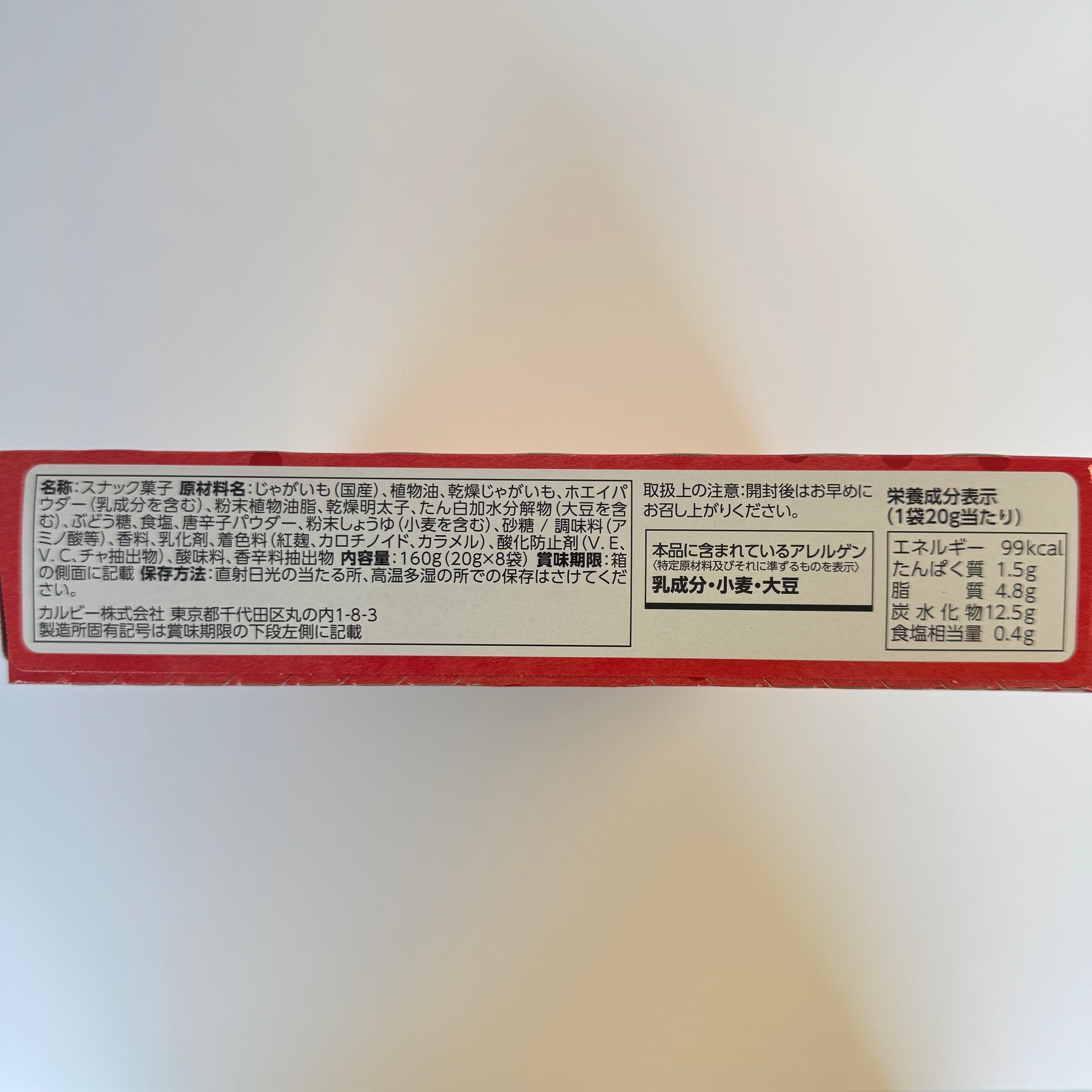 みんな大好きじゃがりこの九州限定明太子味です。ふわっと口に残る明太子の味と、ほんのりピリ辛が後をひきます。明太子の粒も入っていて見た目も味も楽しい商品です。 内容量 160g(20g×8袋) サイズ(縦×横×高さ) 24×20×4