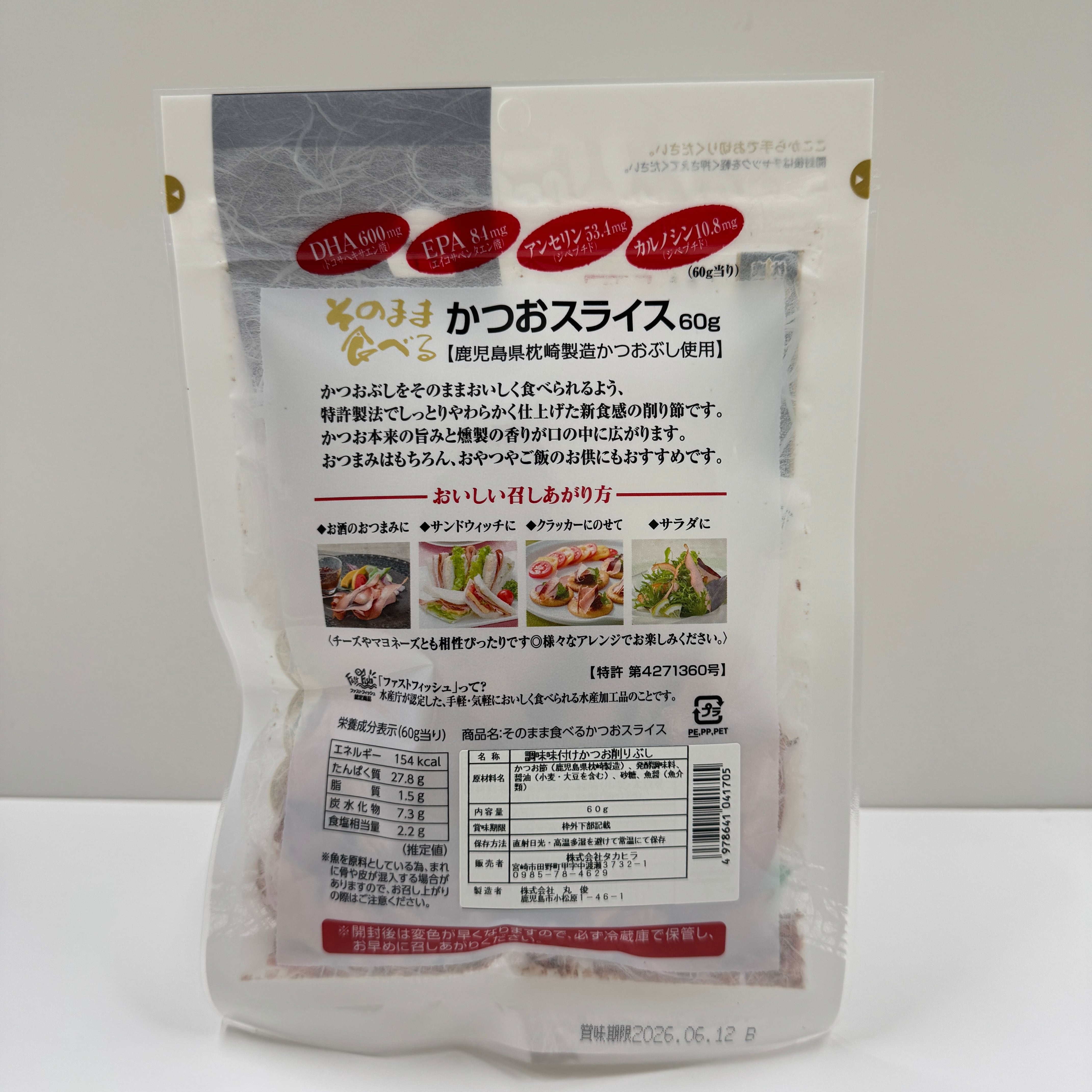 鹿児島県枕崎産のかつおぶしを使用。 しっとりとした半生タイプの新食感の削り節です。 (内容用 60g サイズ 縦24㎝×横17㎝×高さ2㎝)