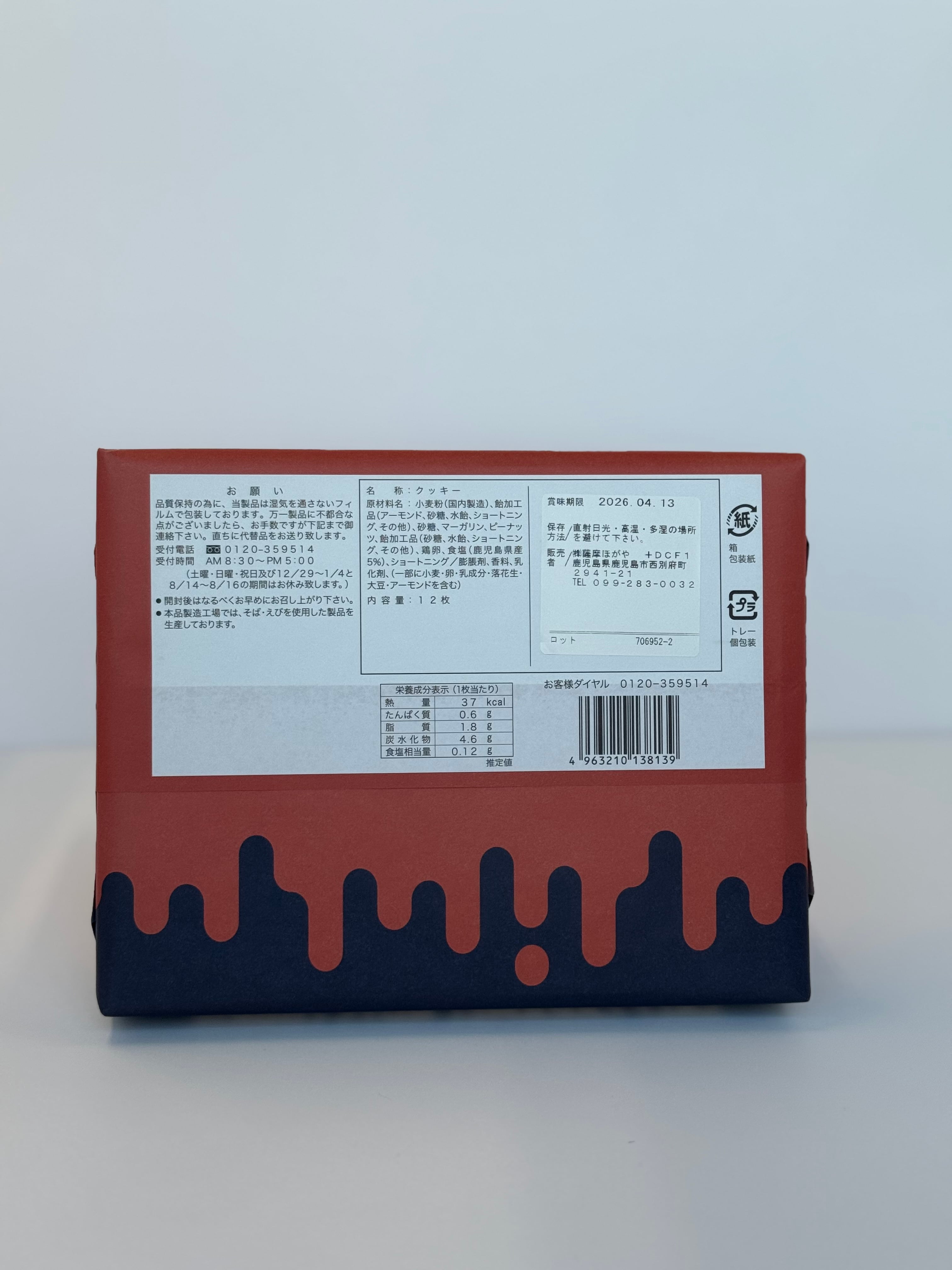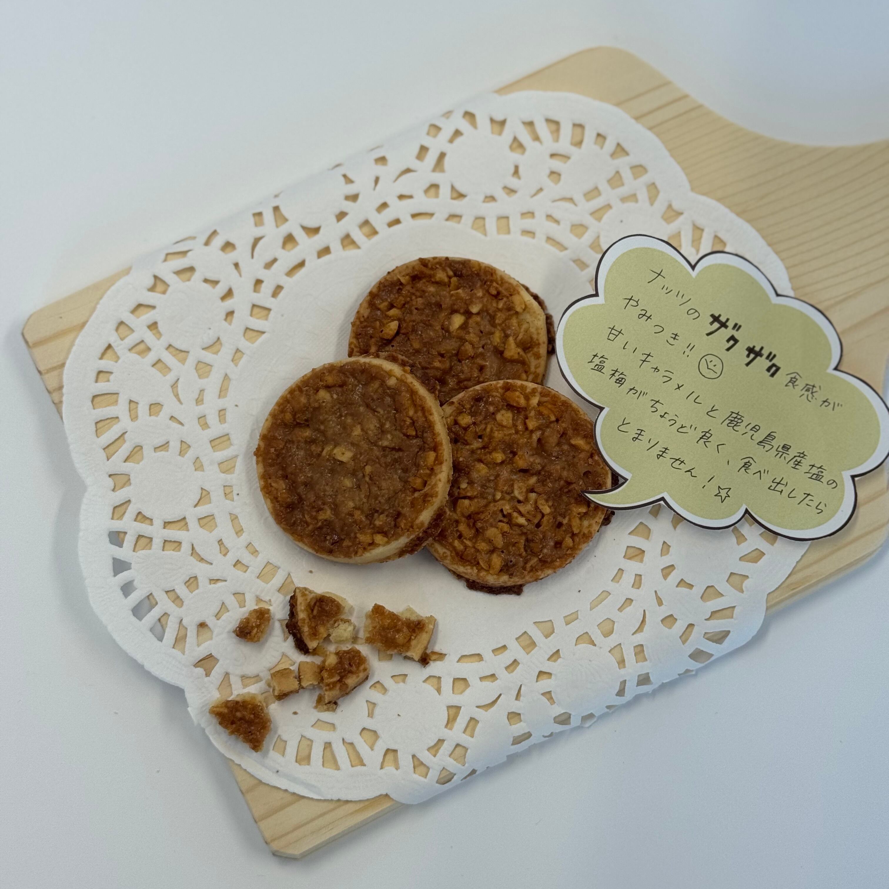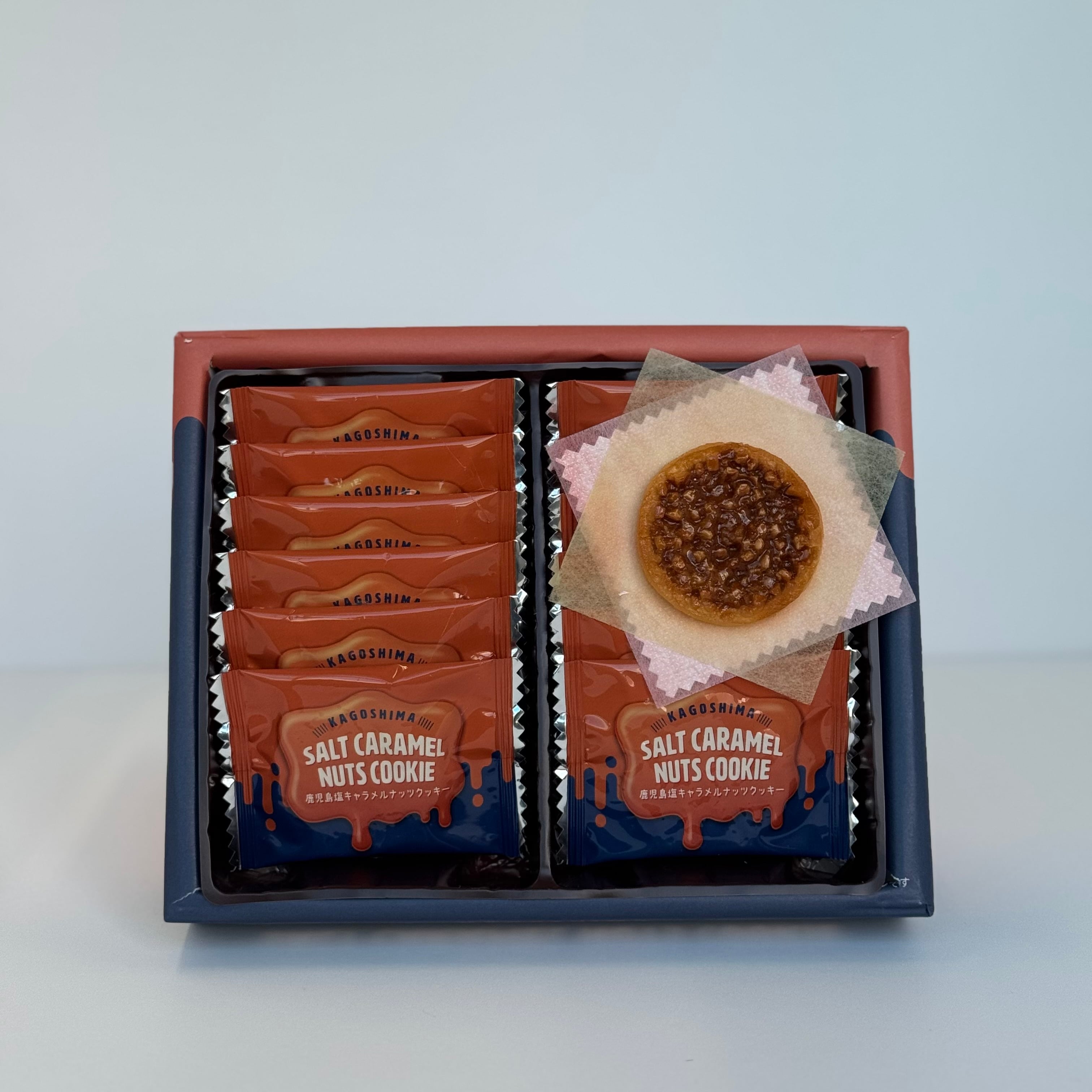 鹿児島県産の塩を使用した、甘じょっぱいクッキーです。 サクサクしたクッキーの上に、砕いたナッツと甘いキャラメル、塩をコーティングしてあります。 内容量 12枚 サイズ(縦×横×高さ) 17.5×22×4