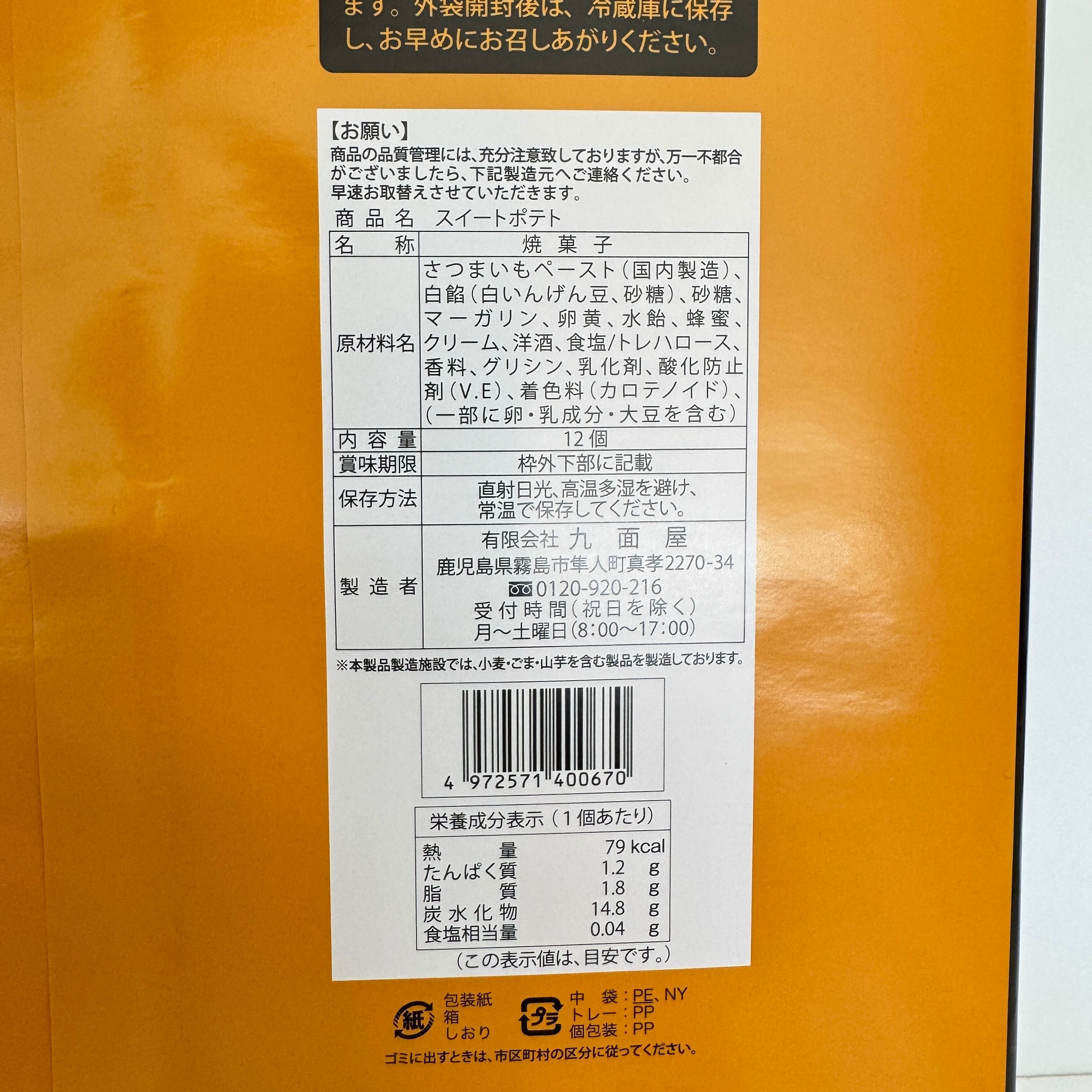 さつま芋を生クリームで合わせ焼き上げた、しっとり濃厚なスイートポテトです。 内容量 12個 サイズ(縦×横×高さ) 33×23.5×4