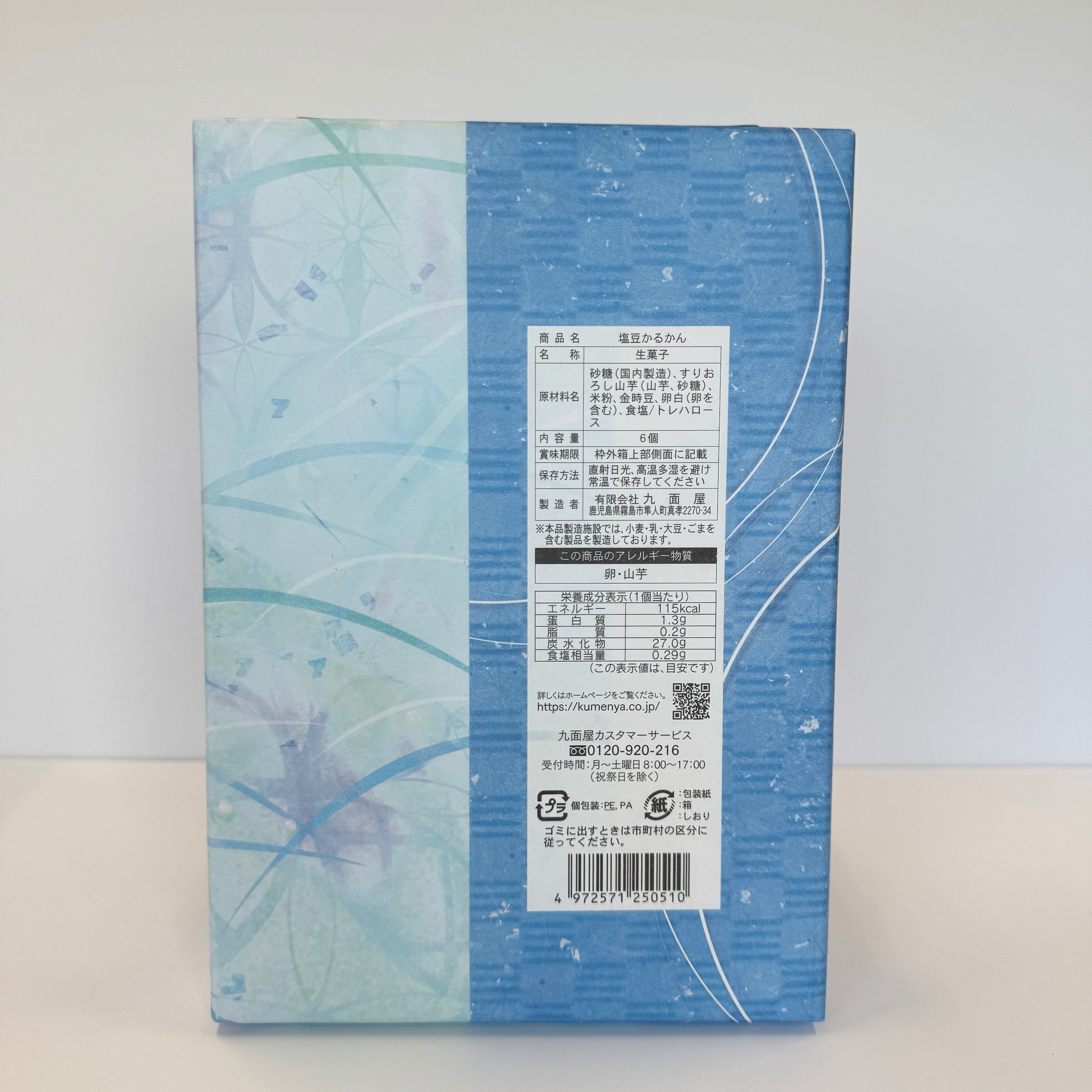鹿児島県与論島の「星の砂塩」を練り込み、 北海道産の金時豆がトッピングされた塩辛さと甘みの調和がとれた新感覚のかるかん饅頭です。 内容量 6個