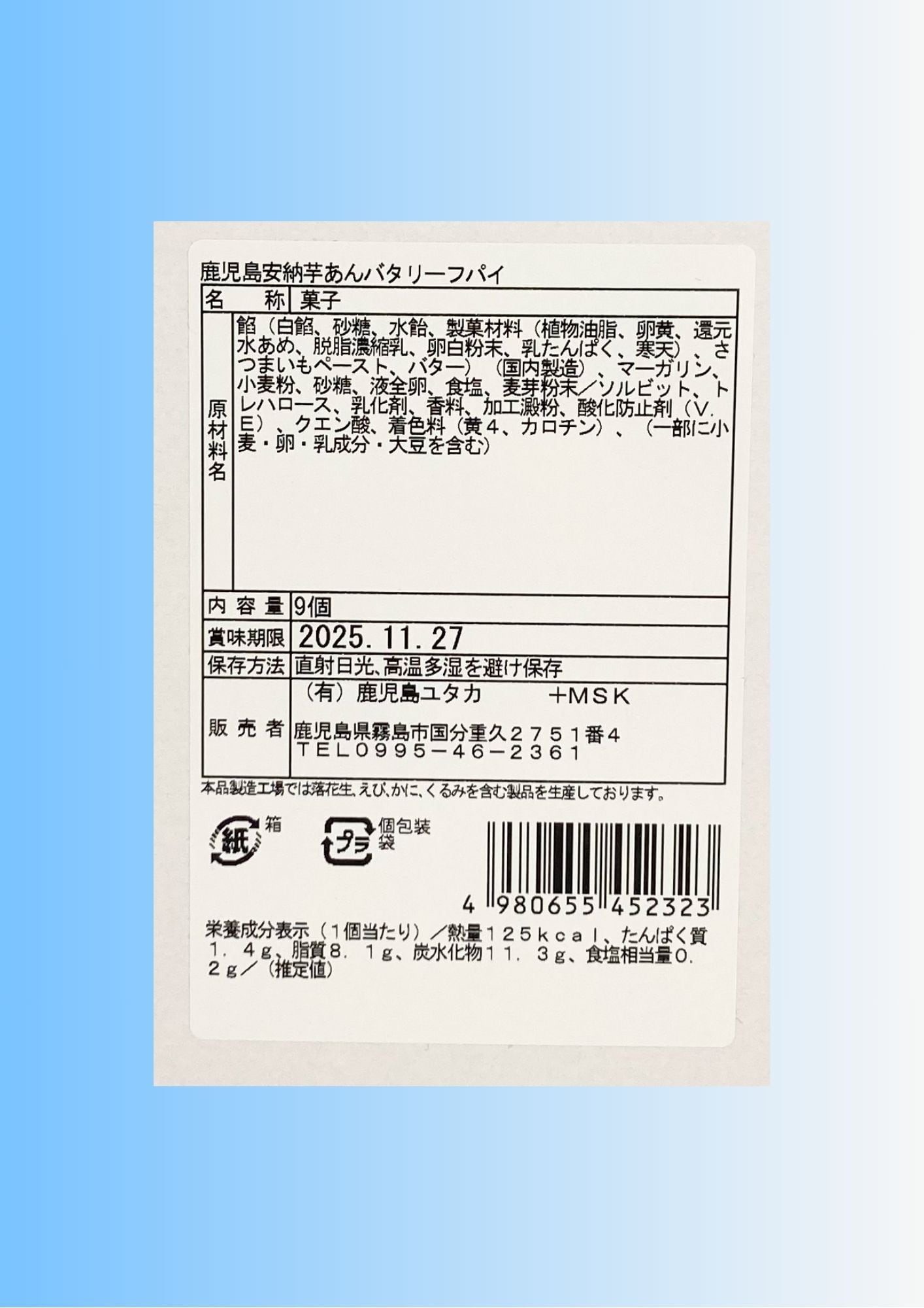 鹿児島県産安納芋を使用した餡とバターが美味い、サクサクリーフパイです。 こちらは、9枚入りとなっております。