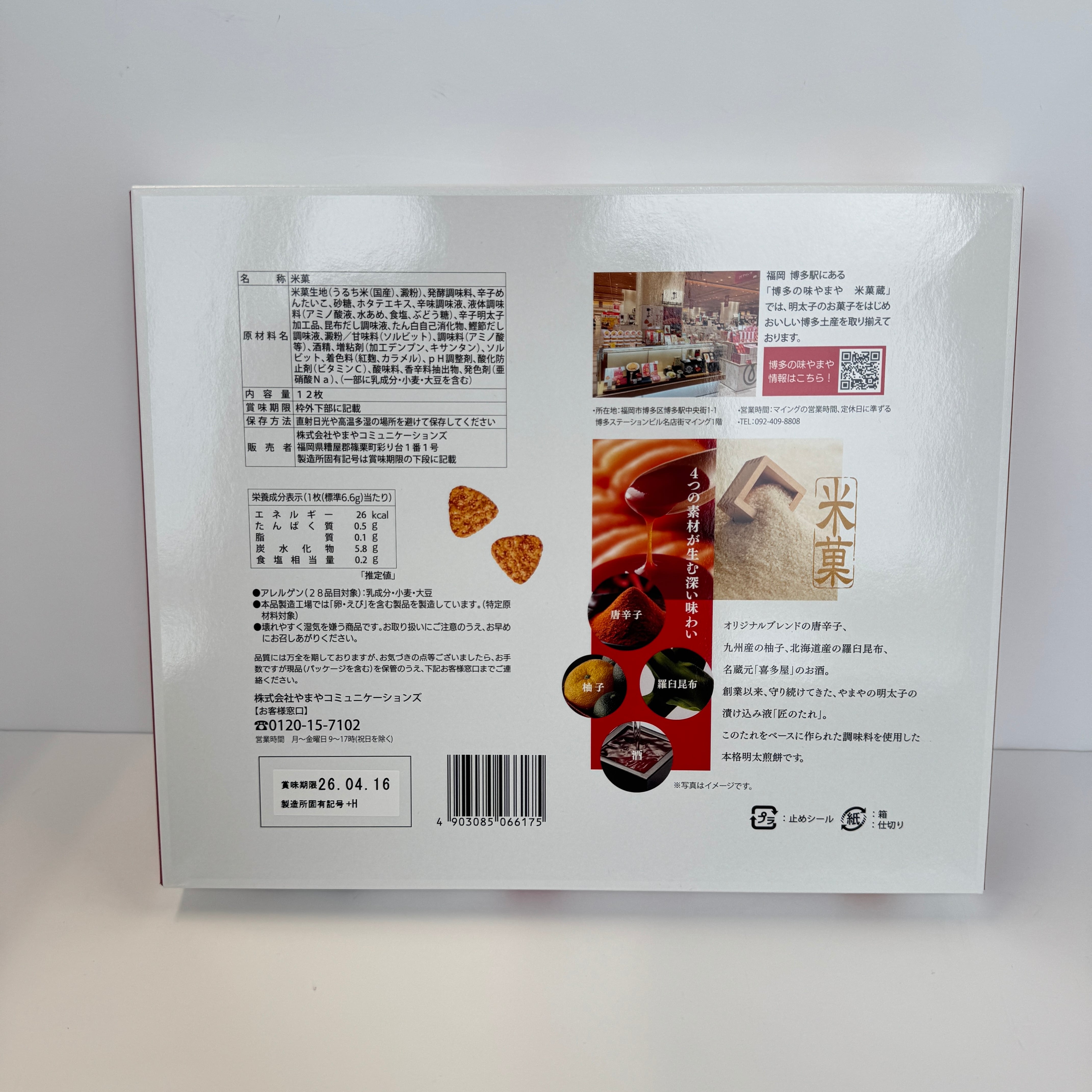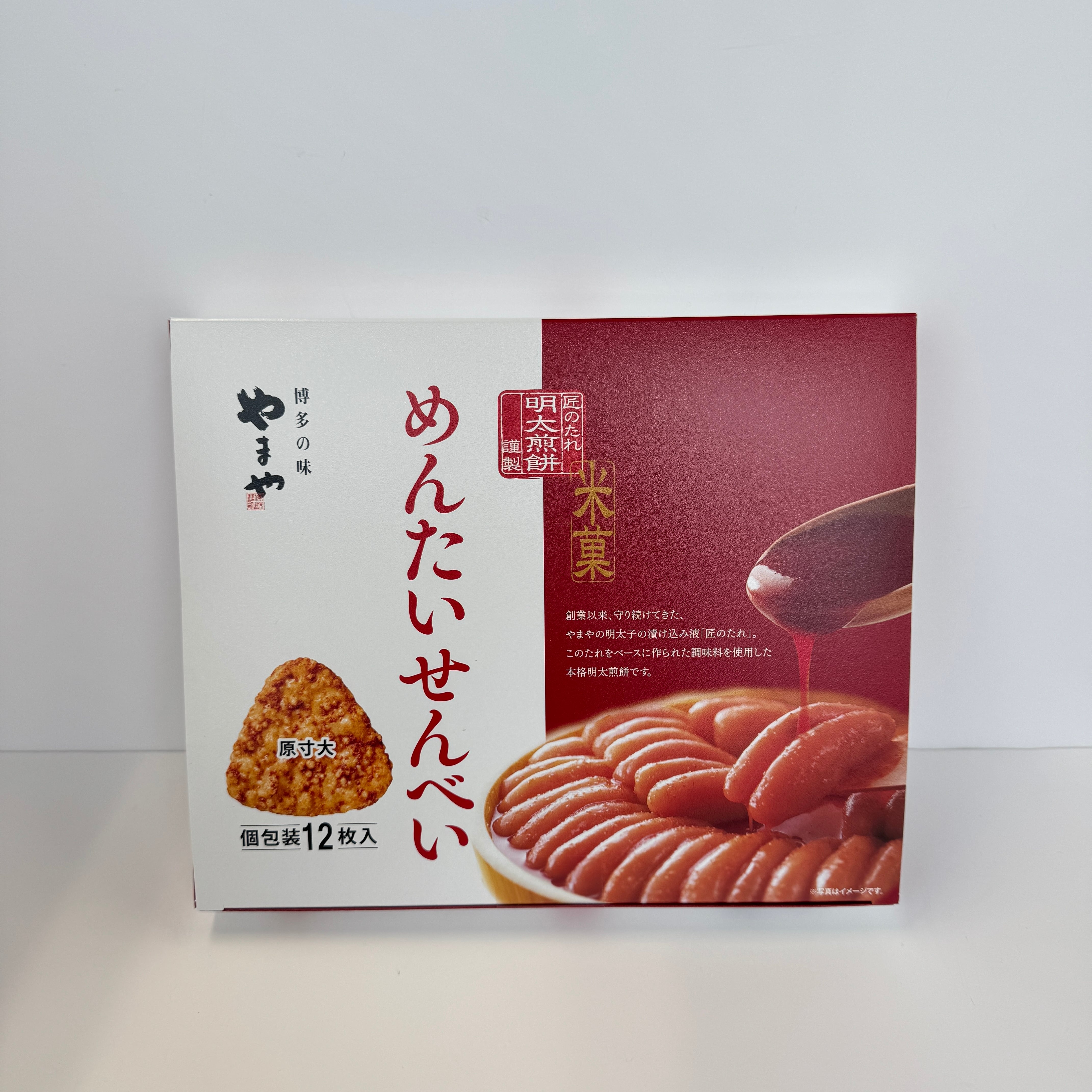 国産うるち米の粒の素材感が残るせんべいに、明太子の旨味たっぷりの旨辛たれ 『めんたい辛みソース』を絡ませました。 パリッと香ばしく上品な食感の中に、明太子の旨辛さが広がります。 (内容量 12枚入り サイズ 縦22㎝×横17㎝×高さ4㎝)