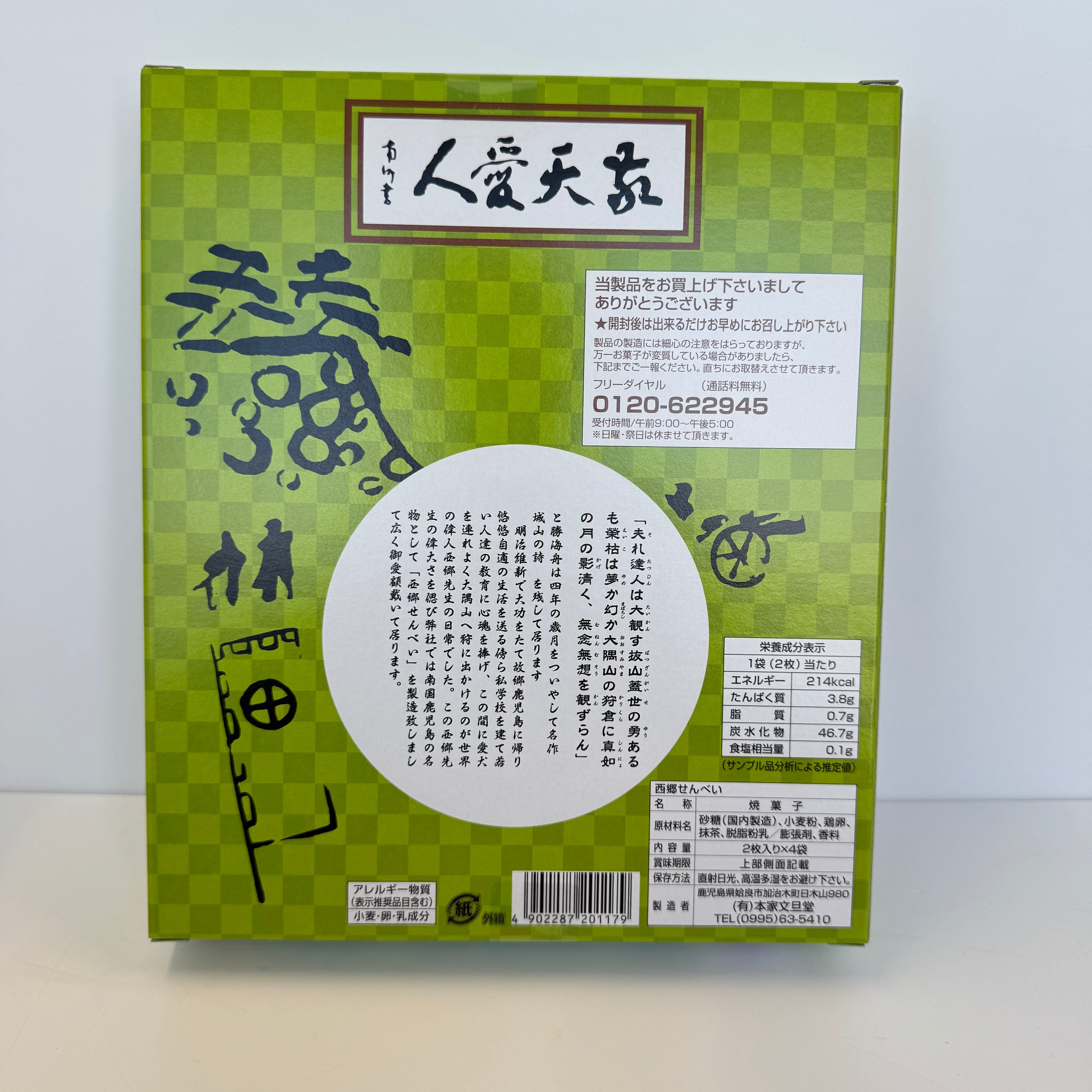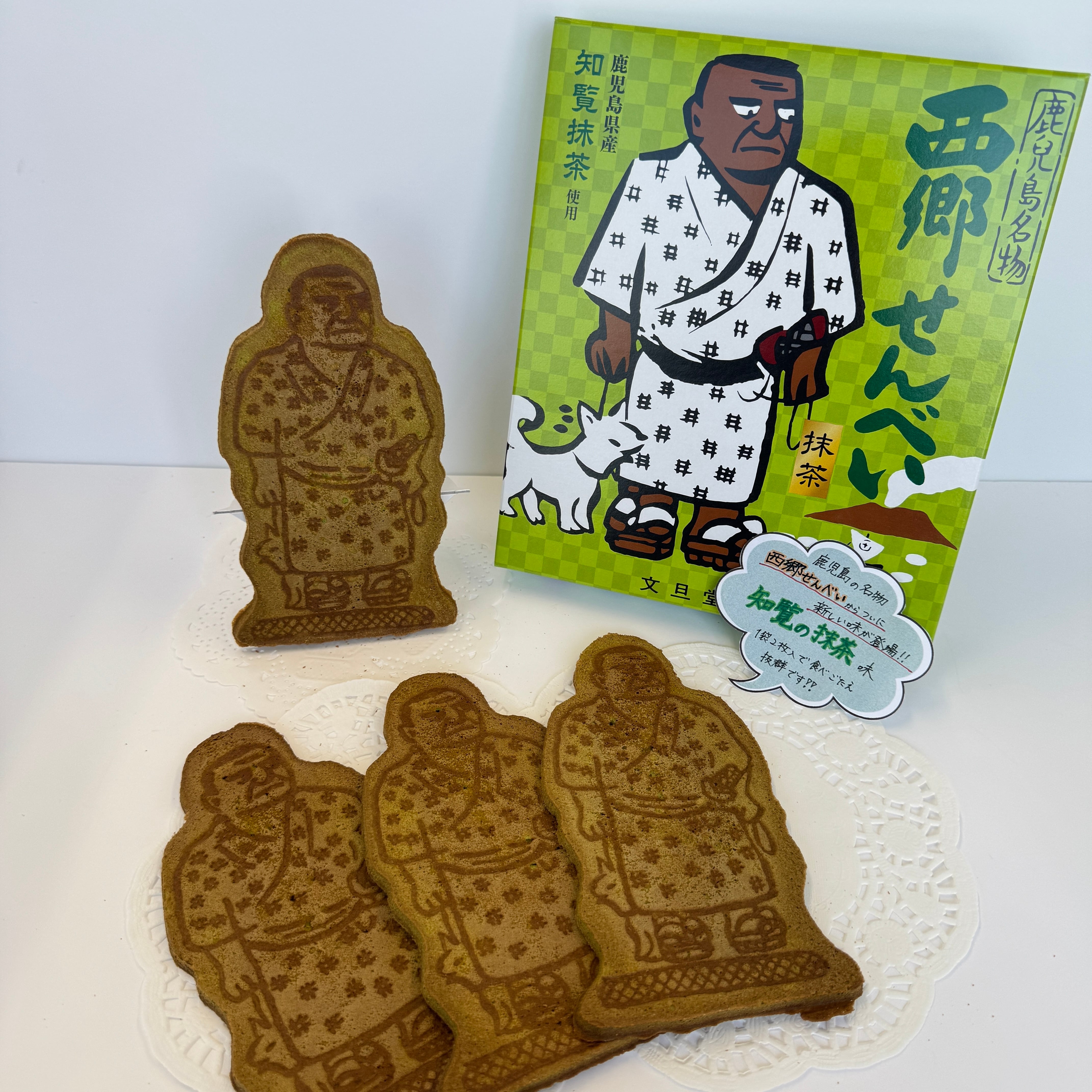 鹿児島名物『西郷せんべい』になんと抹茶味が新登場! 鹿児島県産の知覧抹茶を使用しています。 サクサク、カリカリと香ばしいおせんべい。 抹茶の香りと味をお楽しみください。