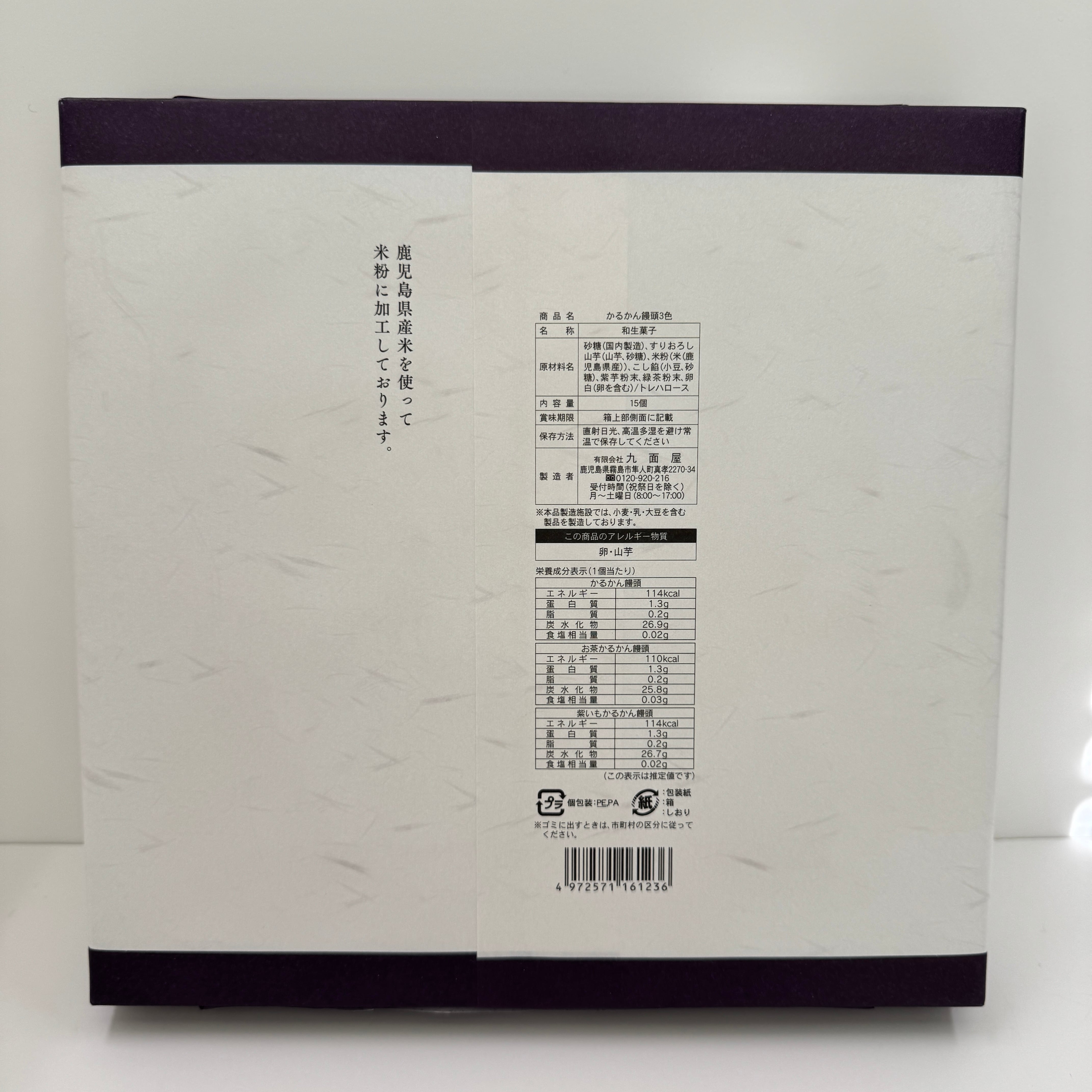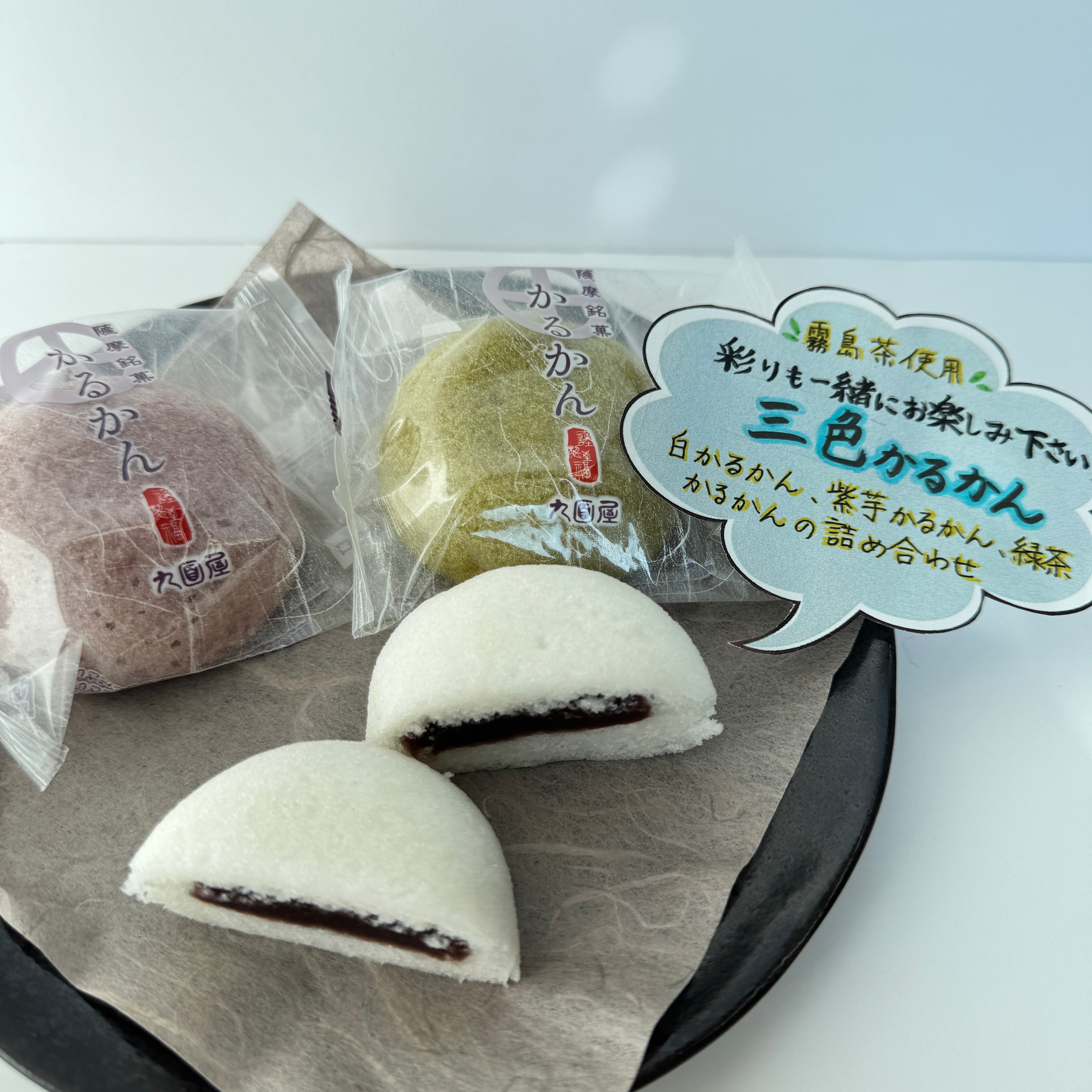 山芋、米粉を使った生地の中にこし餡を包み込み蒸しあげた、 しっとりとした3色のかるかん饅頭です。 茶かるかんは生地に霧島茶、紫芋かるかんは生地に県産の紫芋が練りこまれています。 内容量 15個