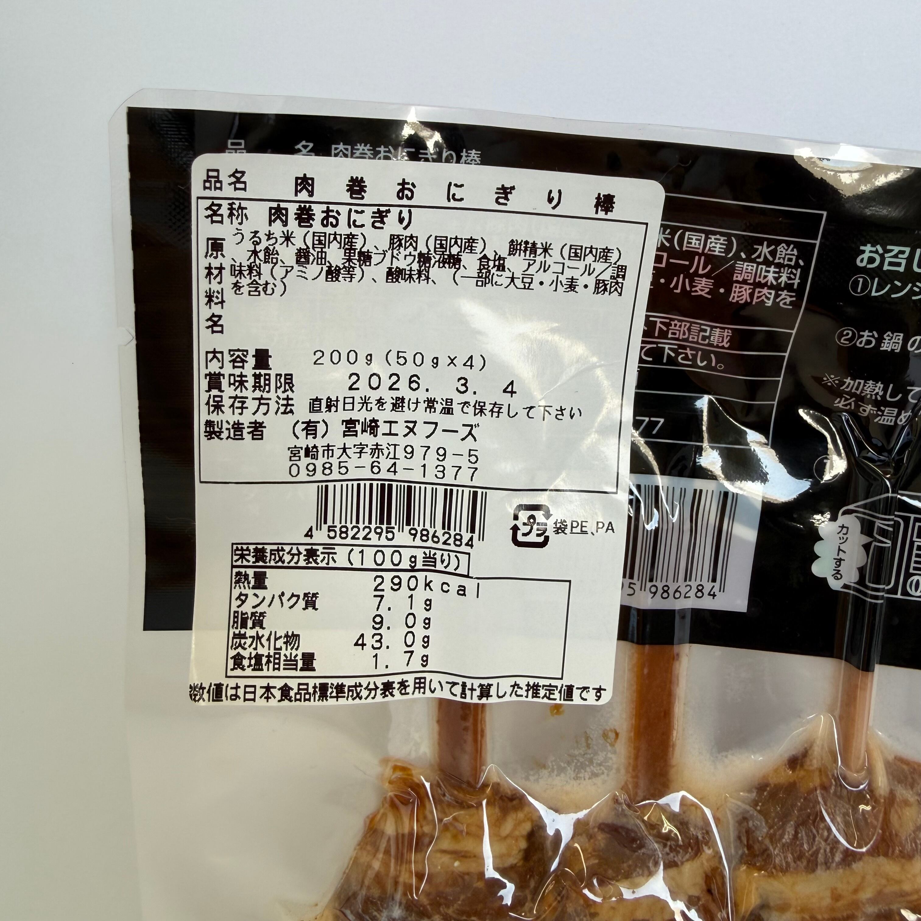 宮崎名物の肉巻きおにぎりを食べやすい大きさのスティック状にし、焼き上げました。 夕食のもう一品、お酒のお供にもピッタリな商品です! ※常温で保存可能です。 内容量 200g(50g×4)