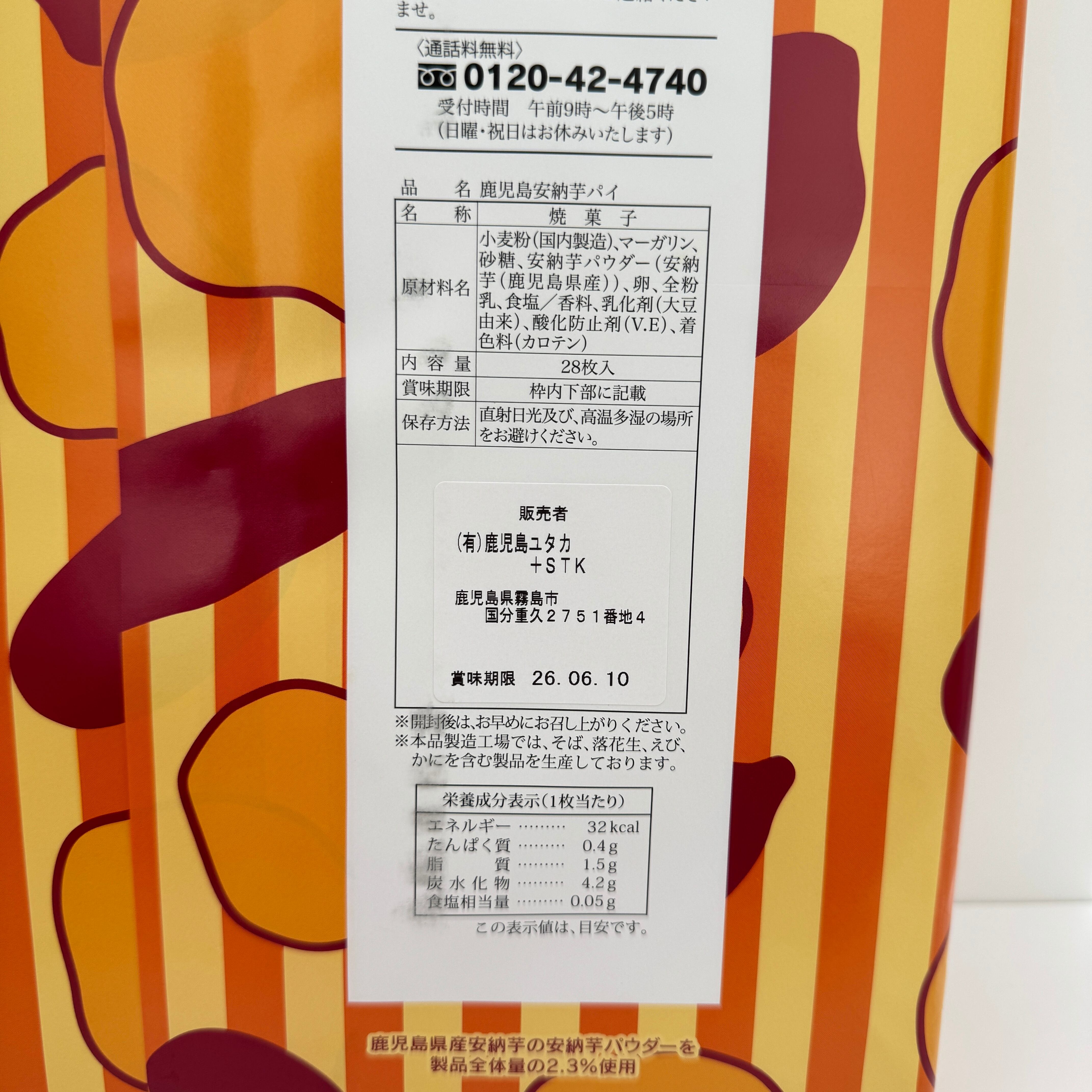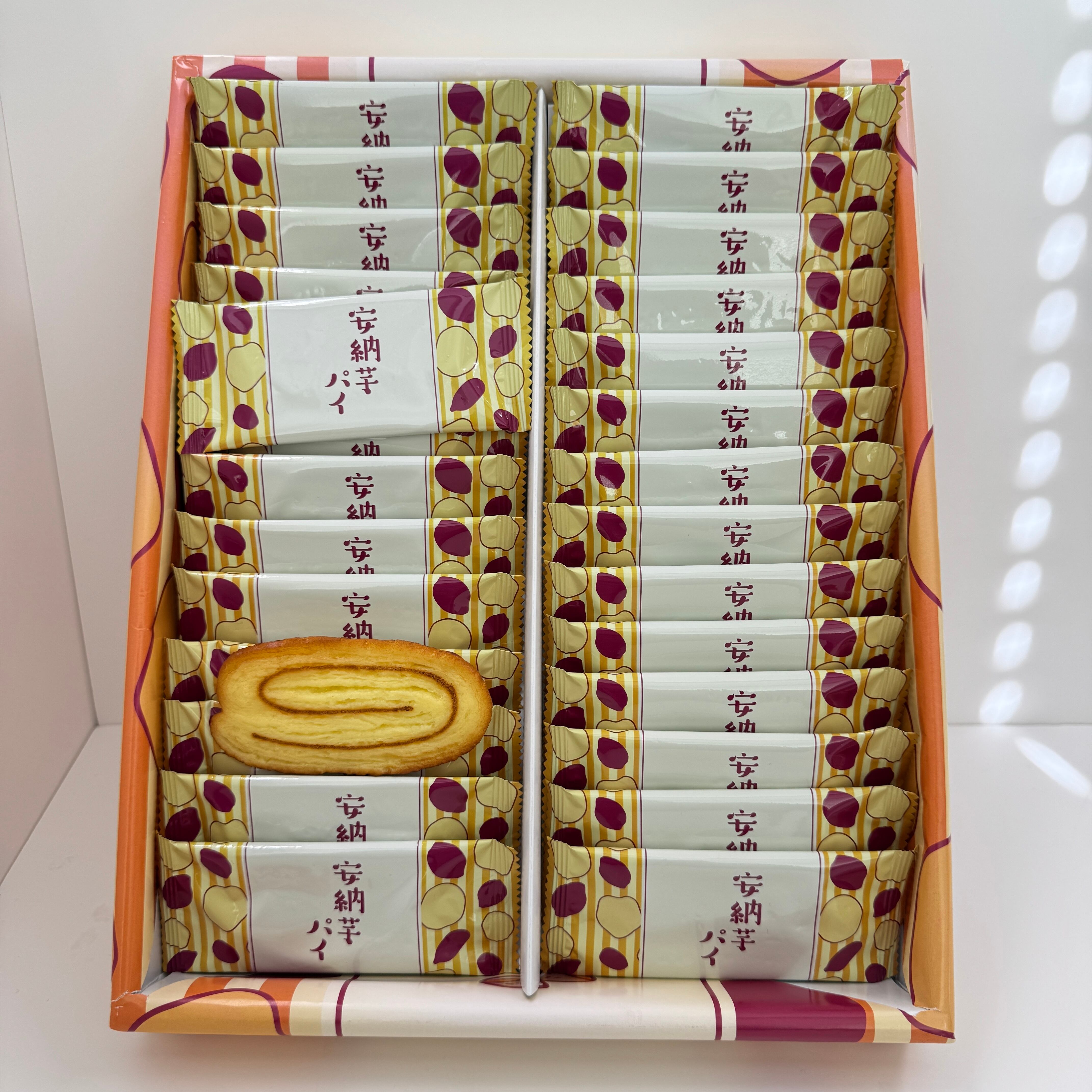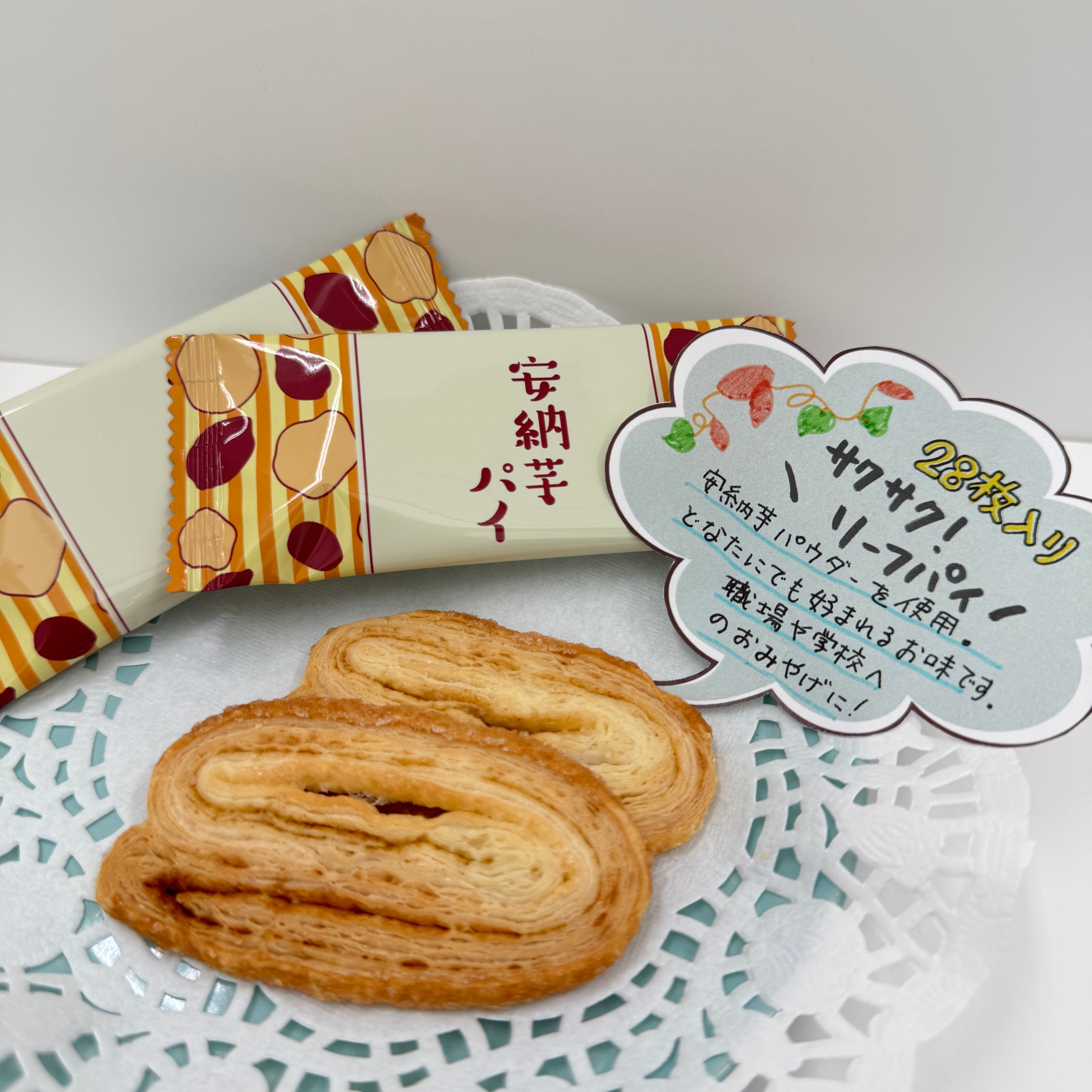 鹿児島県産安納芋パウダーを使用した、サクサク美味しいリーフパイです。 28枚入り大容量なので、職場や学校へのお土産にもピッタリ! 内容量 28枚