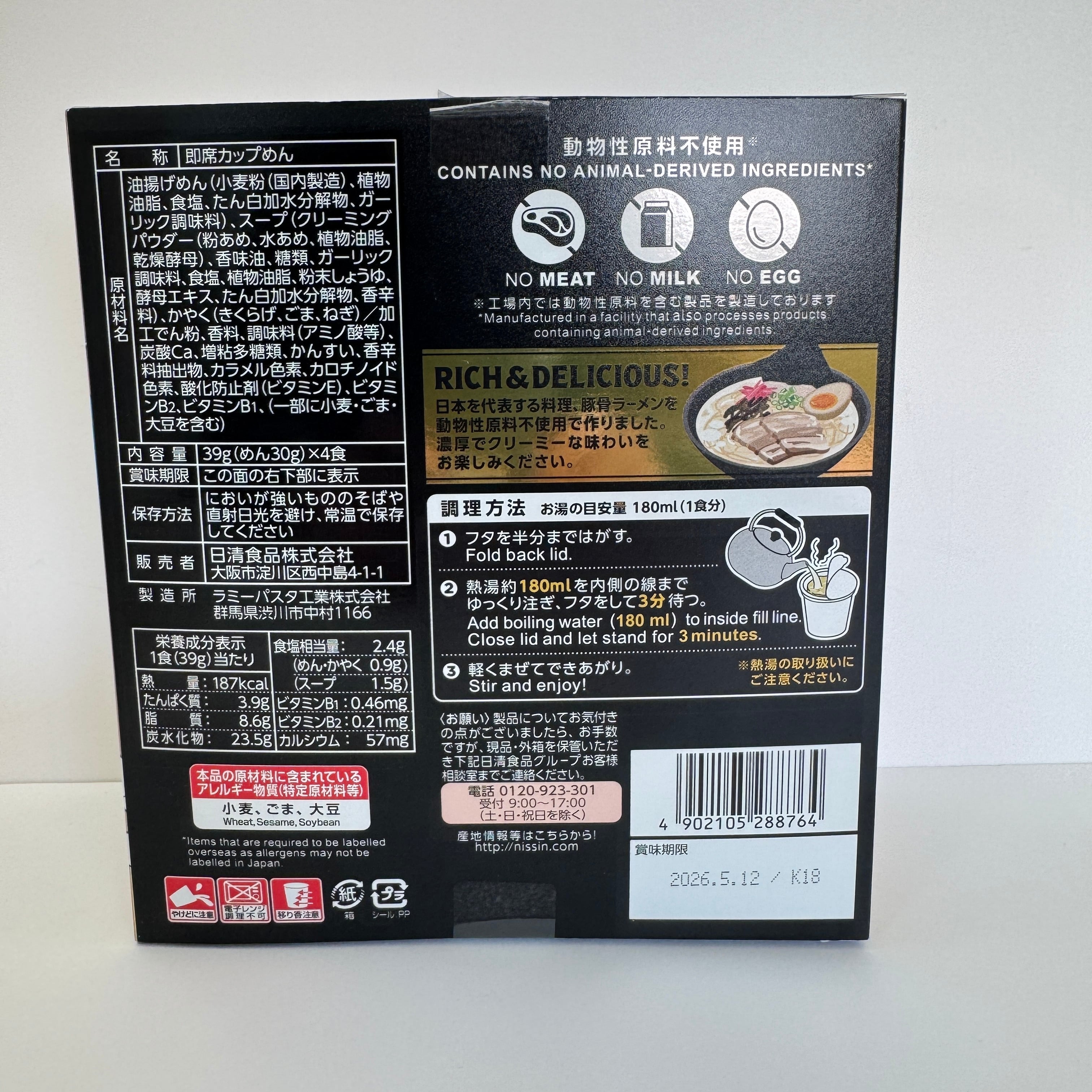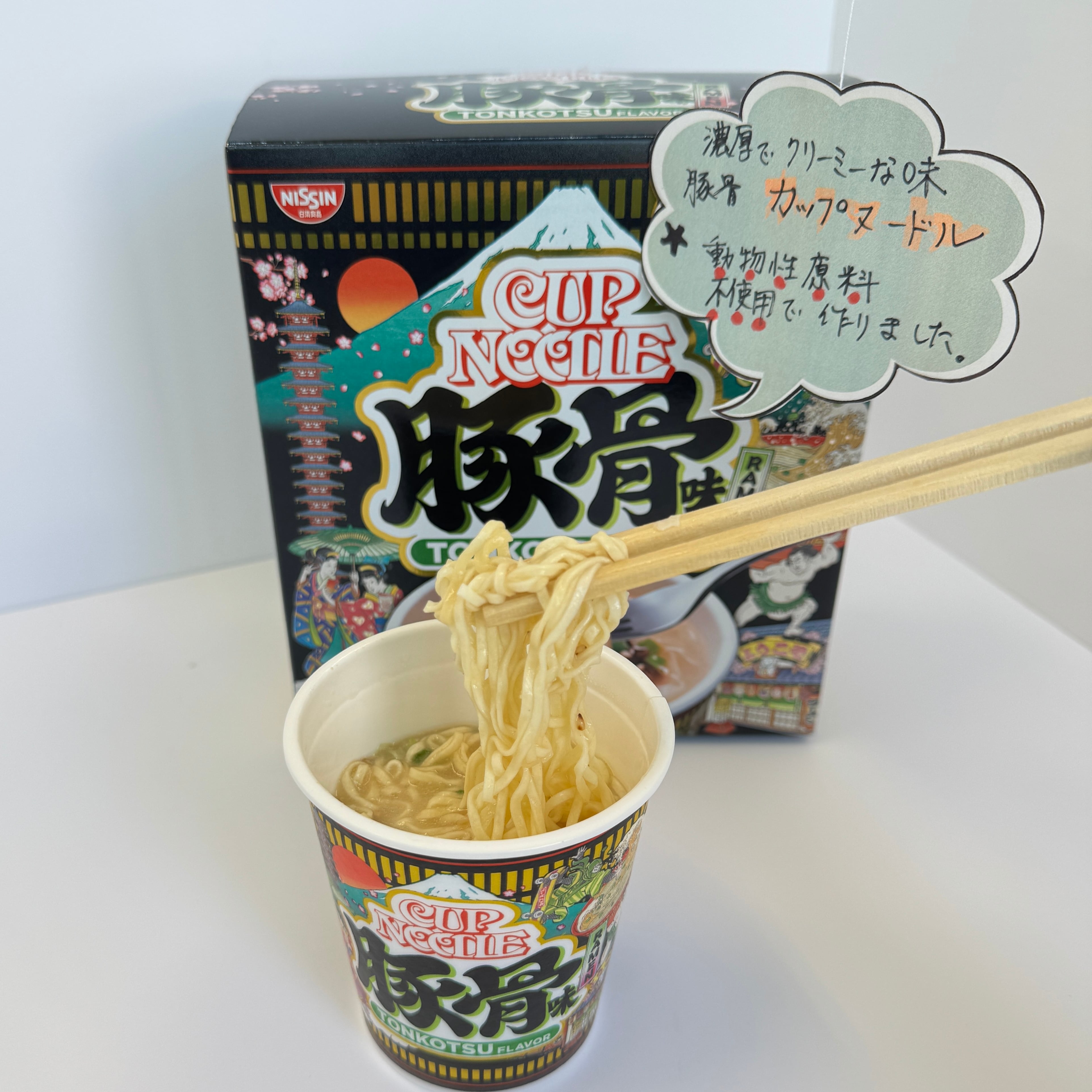 ``動物性原料不使用‘‘ なのに!!豚骨味の「カップヌードル」が登場! お湯を注ぐだけで食べられるミニサイズのカップ麺が4食入っているので、お友達やご家族へのお土産にピッタリです☆