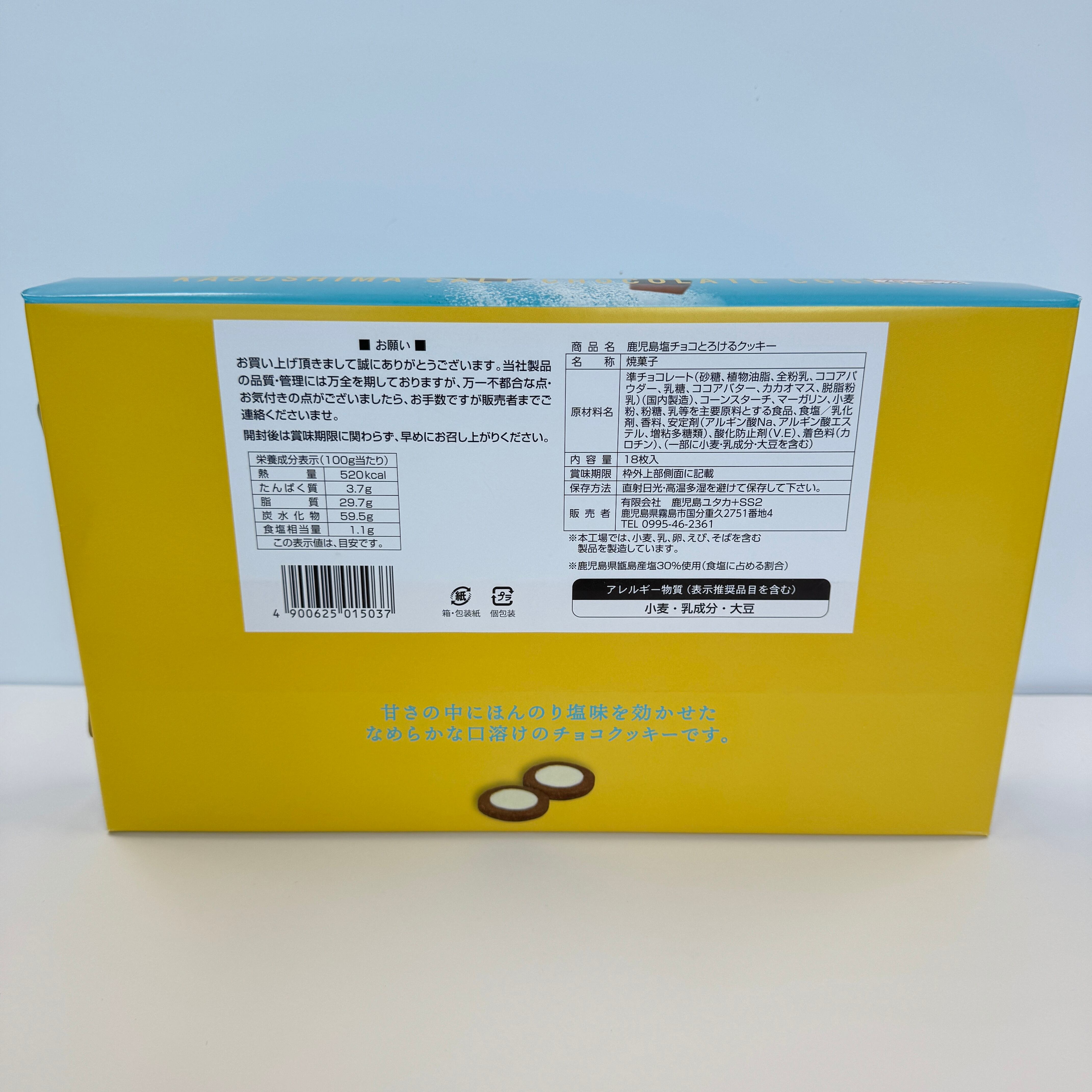 鹿児島県産こしき海洋深層水塩を使用した とろける塩チョコくっきーです。 お口の中でほろほろっとろけるクッキーは、 リピート間違いなし!冷やして食べるとまた、食感も変化して おすすめです! ※こちらは、18枚入りとなっております。